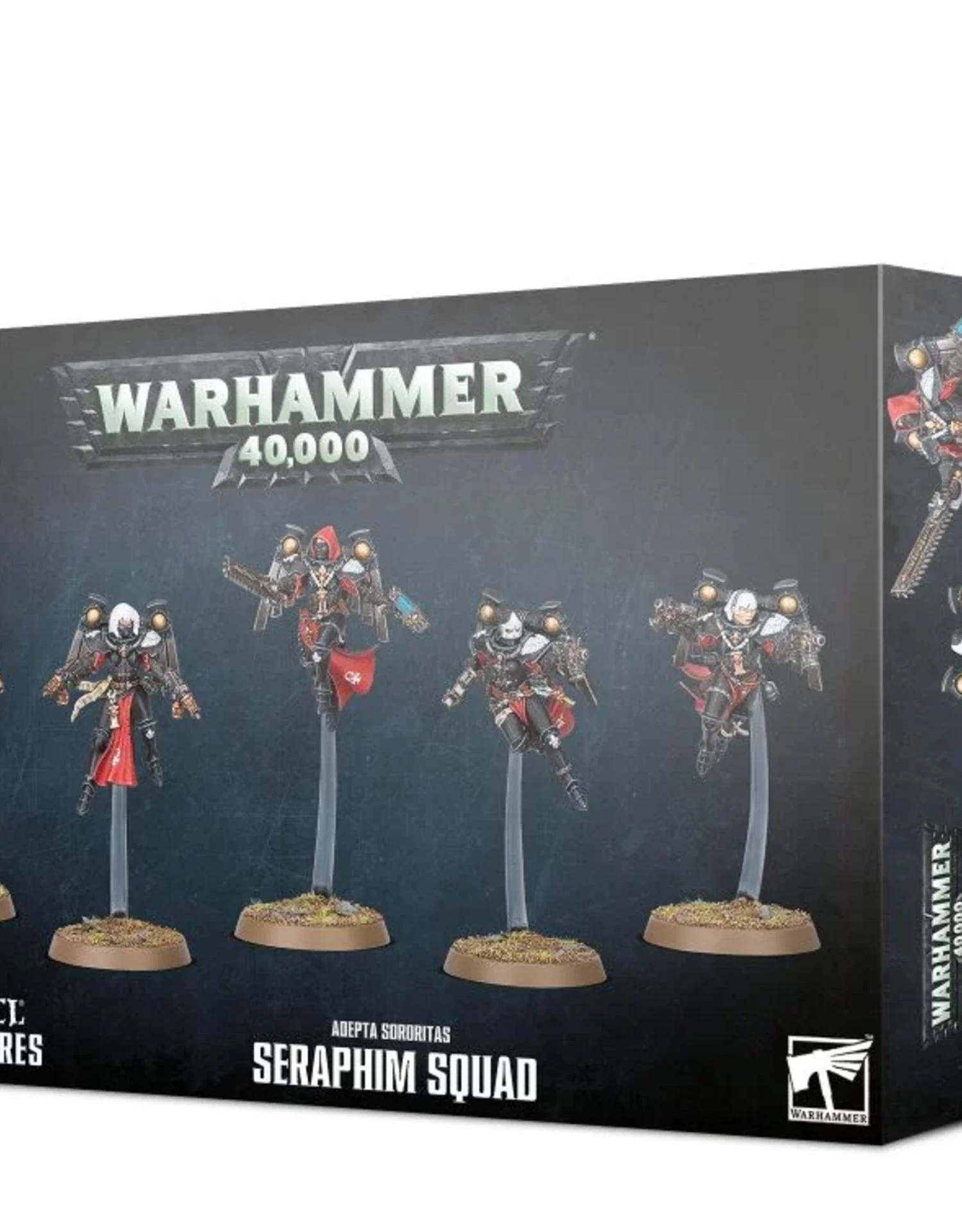 The kit builds five Seraphim. The Seraphim each carry two bolt pistols, though two of their number can instead be equipped with hand flamers while two more can bear inferno pistols. One model can be assembled as a Seraphim Superior, armed with a bolt pistol or plasma pistol in one hand and a choice of bolt pistol, chainsword or power sword in the other.