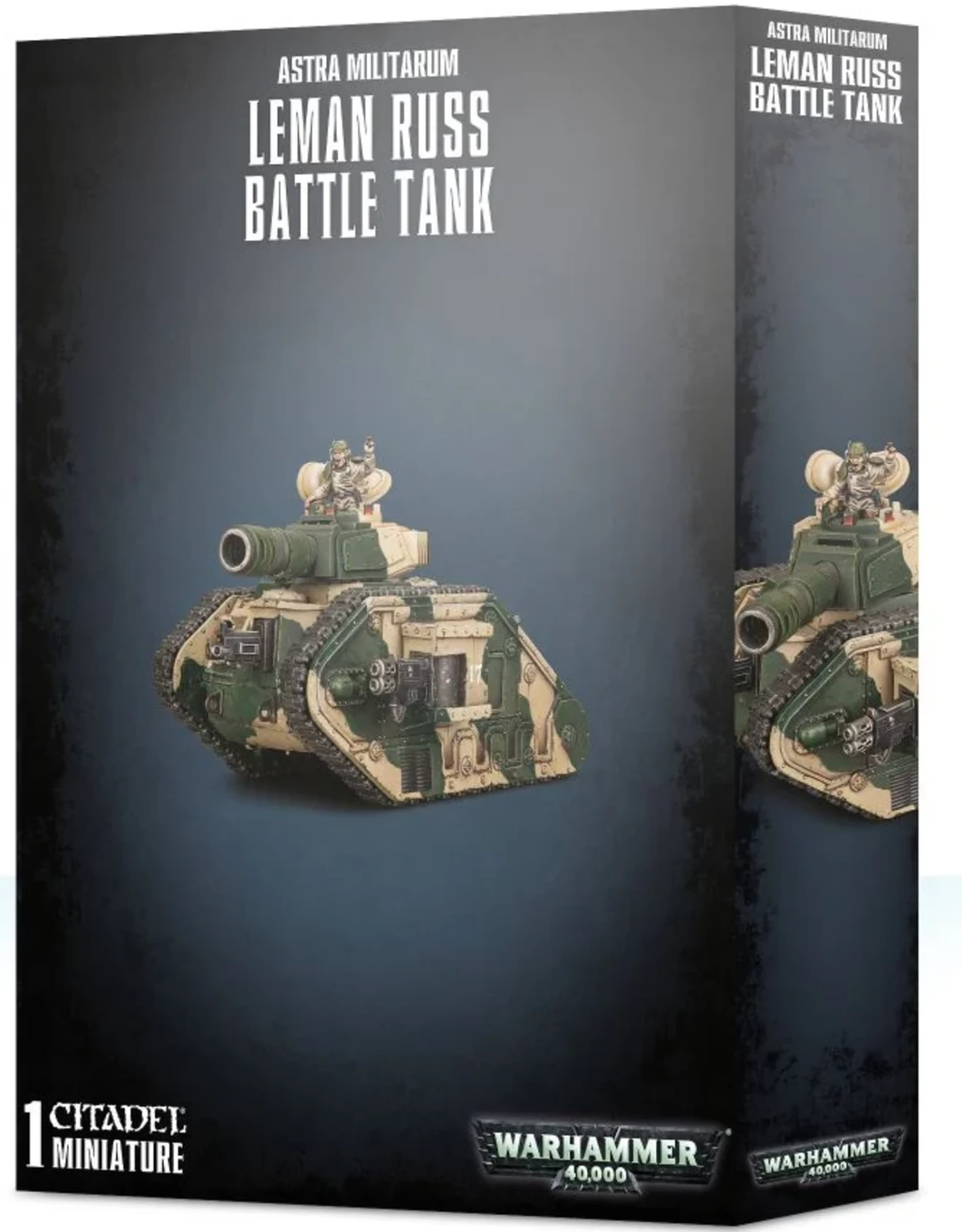 This box set contains one multi-part plastic Imperial Guard Leman Russ Battle Tank. This 95-piece kit can be assembled as a Leman Russ Battle Tank, Eradicator, Exterminator or Vanquisher. Also included are plenty of alternate weapons and wargear options, and a sheet of Imperial Guard water-slide tank transfers.