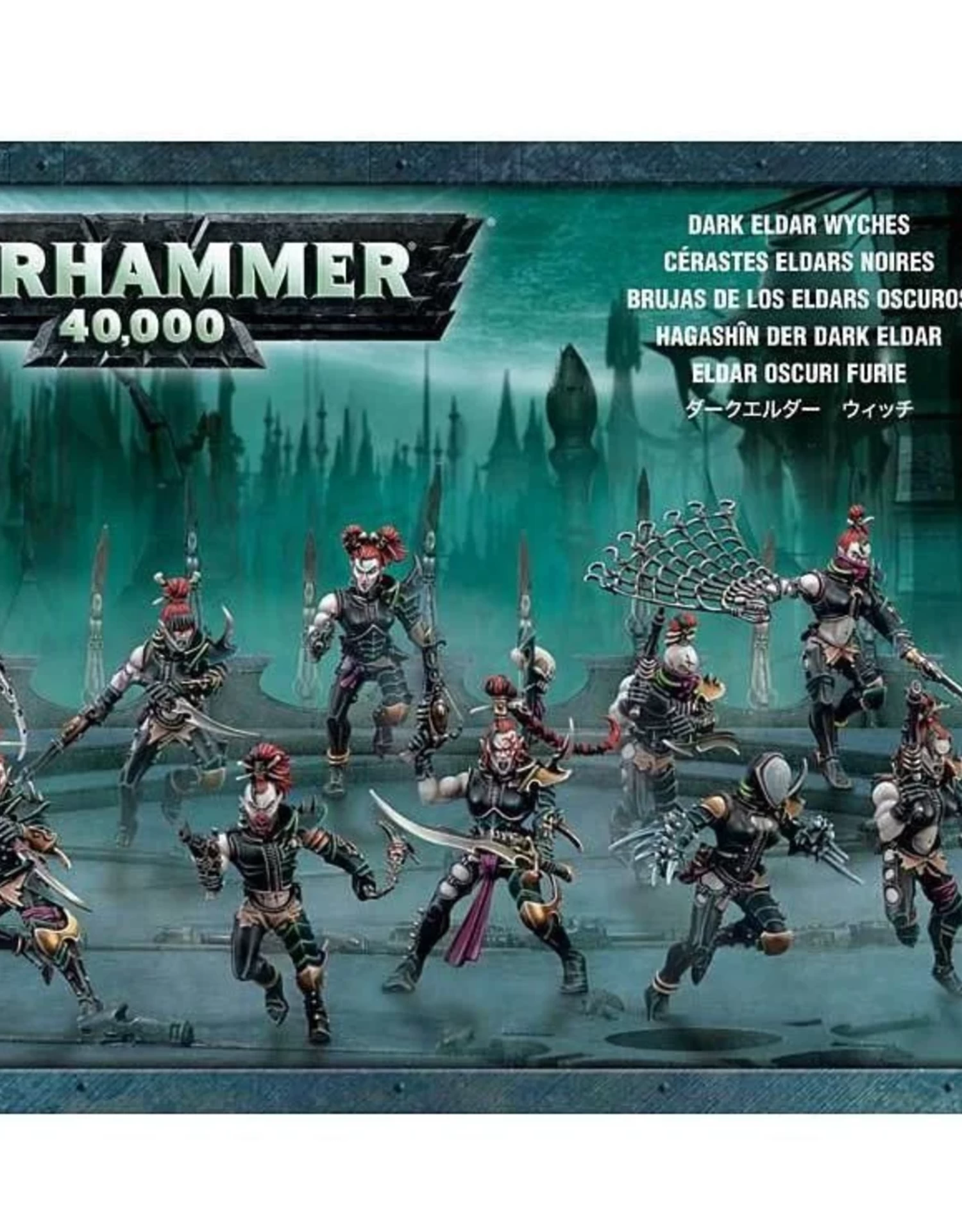This box set contains 10 multi-part plastic Drukhari Wyches. This 92-piece set includes: 14 different heads, 10 different bodies (six female variants and four male variants). Also included are all of the weapon options listed in Codex: Dark Eldar, including: a razorflail, a blast pistol, a shardnet, a power weapon and an impaler. Models supplied with 25mm round bases.