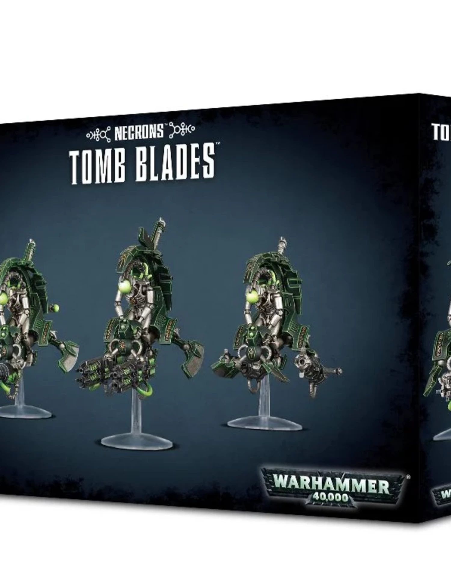 This multi-part plastic boxed set contains 162 components with which to build three Necron Tomb Blades. This set comes with 2 small flying stems, 2 long flying stems, 3 small flying bases and 2 Necron transfer sheets.