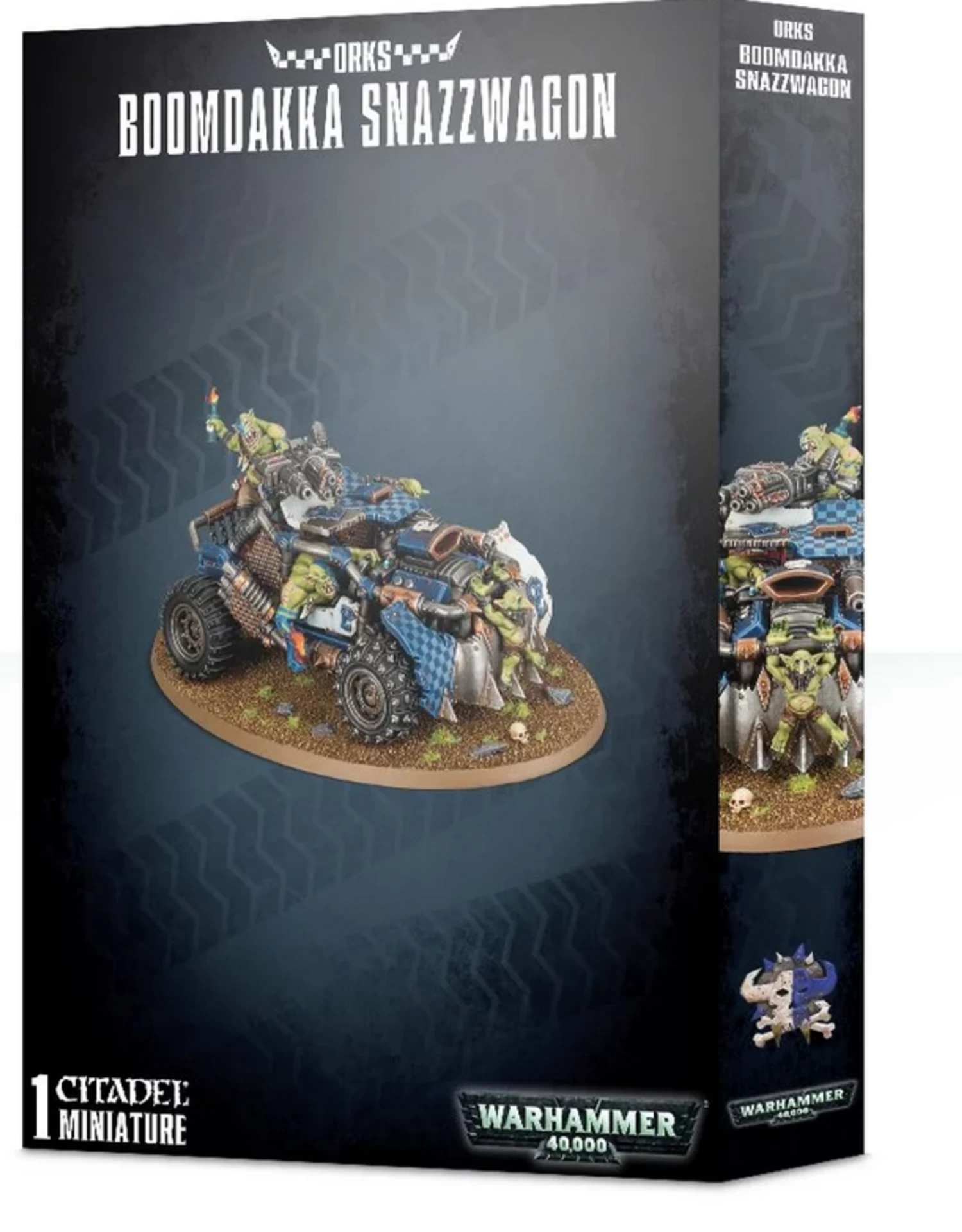 This multipart plastic kit contains the components necessary to assemble a Boomdakka Snazzwagon. Designed for pure speed, it eschews the usual Orky technique of nailing every single bit of metal in the area to a vehicle – you have the option of assembling it without even the roof, exposing the roll cage. Attached to the frame is a network of exhausts and intakes that feed the enormous, powerful engine mounted in the front. As well as this engine, the front of the Snazzwagon features a massive dozer blade, with a masked Grot tightly strapped on – as if that weren’t enough manic detail, there’s a mek speshul mounted to the left side of the main air intake. The driver is leaning out of the right-hand side, leering ahead with a burna bottle ready to go, while riding shotgun is another Grot, this one waving a blasta. A bellowing Burna Boy balances on the back, burna bottle in one hand and the trigger of a big shoota in the other.