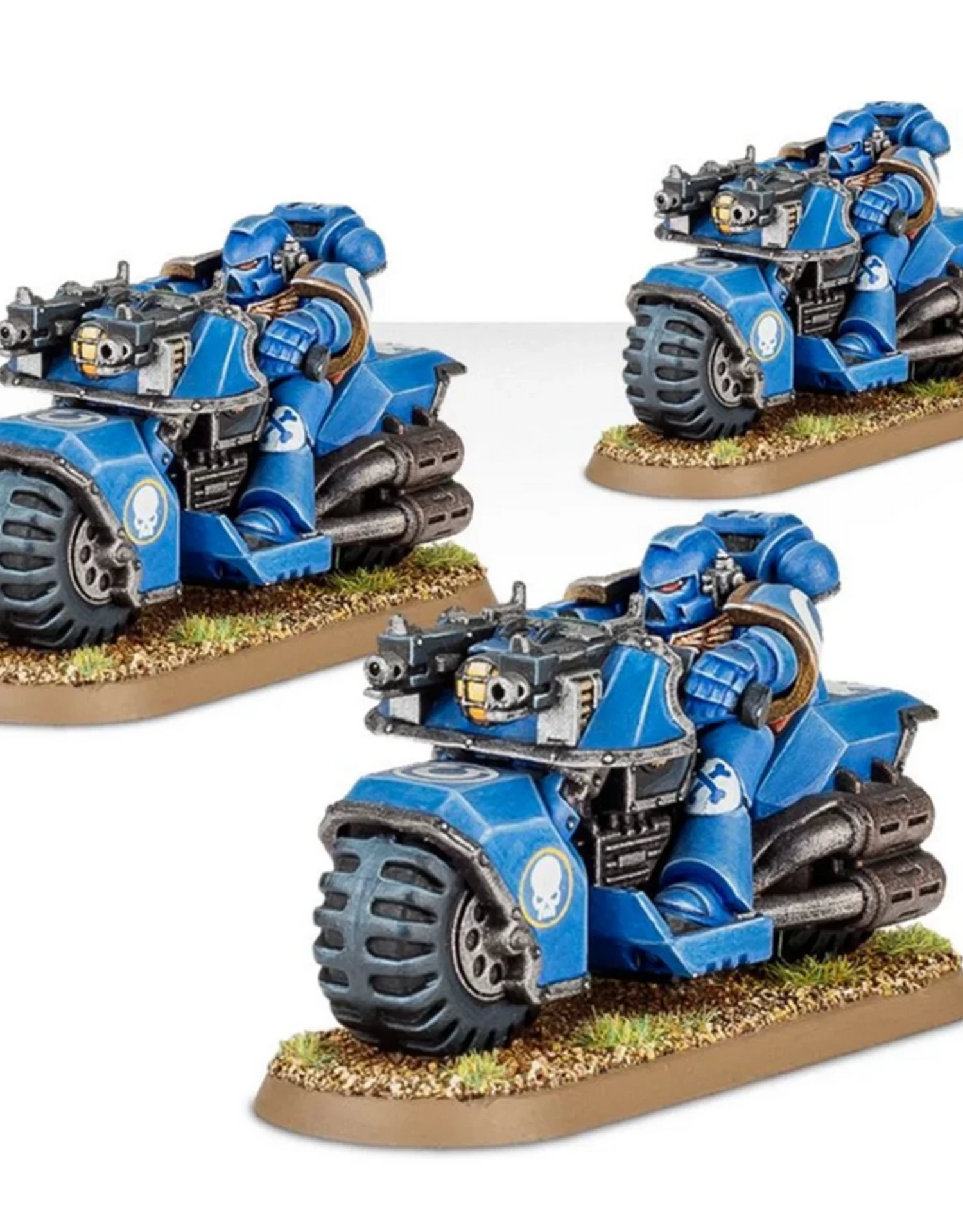 This box is the most cost effective way to buy three multi-part plastic Space Marine Bikes. The kit is supplied with three Bikers, which can be equipped with twin-linked bolters and bolt pistol. Also included is an Ultramarines Infantry Transfer Sheet.