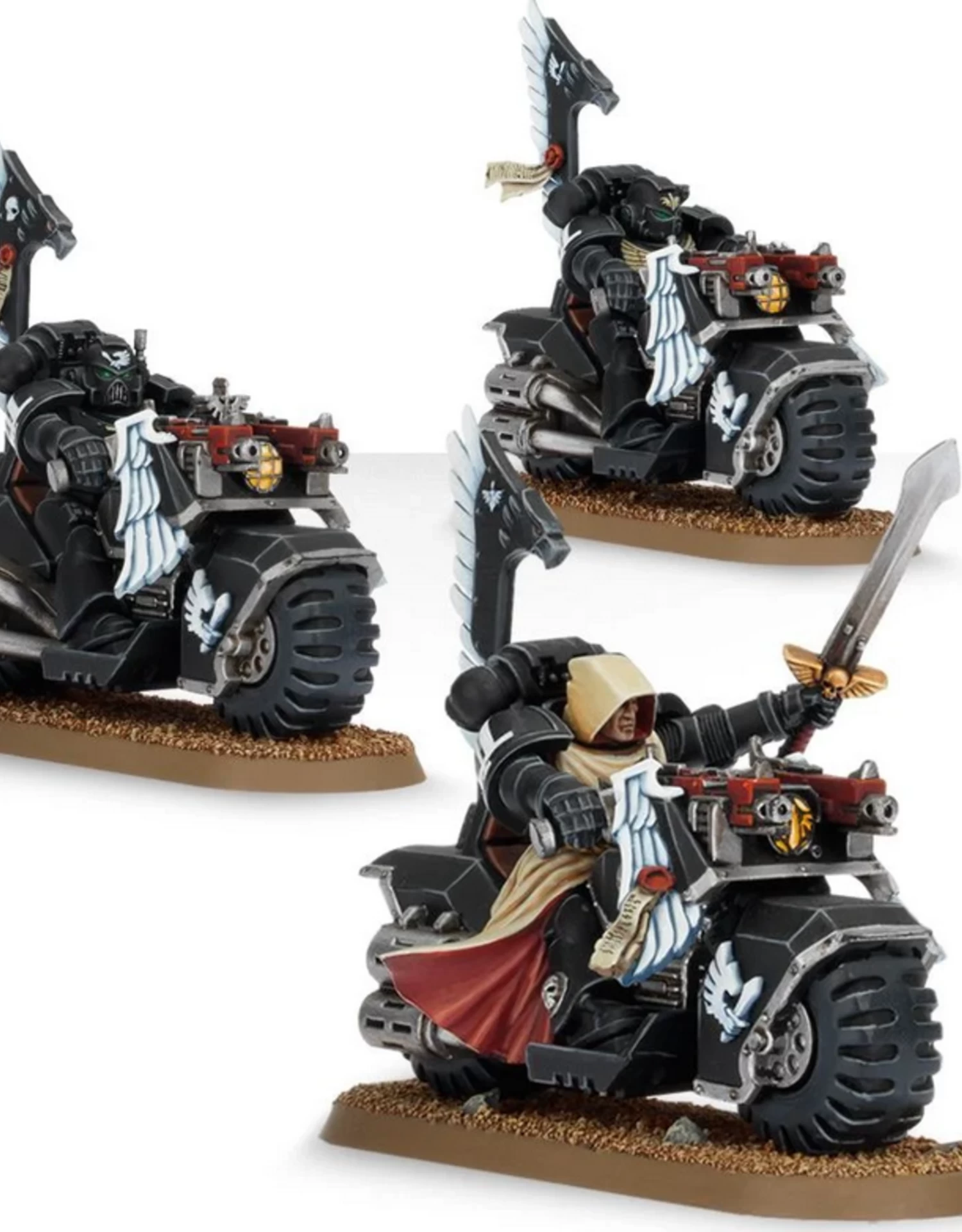 This box set contains three multi-part plastic Ravenwing Bikers, including: options for a sergeant and a host of additional parts for detailing the squad. This set also includes additional components that enable you to convert a Space Marine Landspeeder into a Ravenwing Landspeeder.