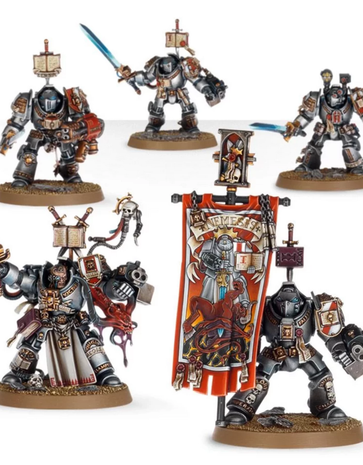 This multi-part plastic boxed set contains 153 components and five 40mm round bases with which to make either a Grey Knight Paladin Squad or Grey Knight Terminator Squad. There is an array of weaponry and unit upgrades including Nemesis falchions, Nemesis force halberds, a Nemesis Daemon hammer, a Nemesis warding stave, a psycannon, a psilencer and an incinerator.