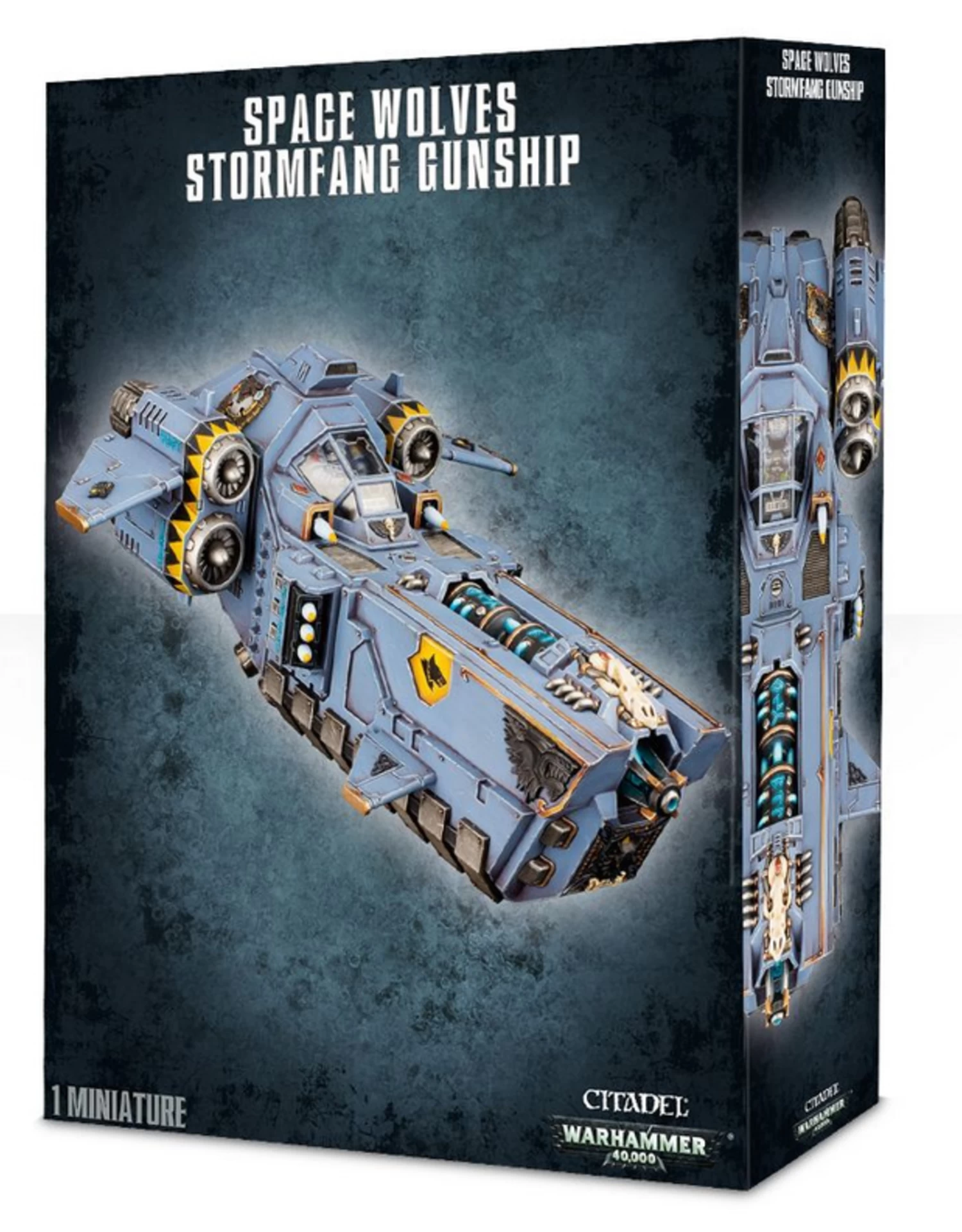 This multi-part plastic kit makes one Stormfang Gunship. It is equipped with a helfrost destructor that runs along the length of its fuselage. This formidable weapon is designed to freeze the target to absolute zero in an instant. The two side sponsons can be equipped with a choice of twin-linked heavy bolters, skyhammer missiles or twin-linked multi-meltas. On the hull you can either mount two stormstrike missiles or replace them with twin-linked lascannon.