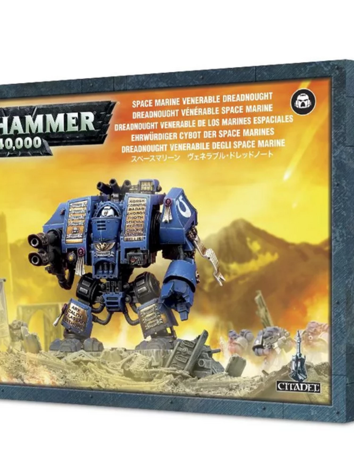 This box set contains one multi-part plastic Venerable Dreadnought. This 84-piece set includes: a plasma cannon, an assault cannon, lascannon, a heavy flamer, a storm bolter, two different power fists including an ornate one, and a set of smoke launchers. Also included are: two different sets of ornate leg guards, three different helmets, six purity seals, two different pennants, a range of different sarcophagus armour plates, several sarcophagus designs, and a host of Crux Terminatus and other Imperial icons.