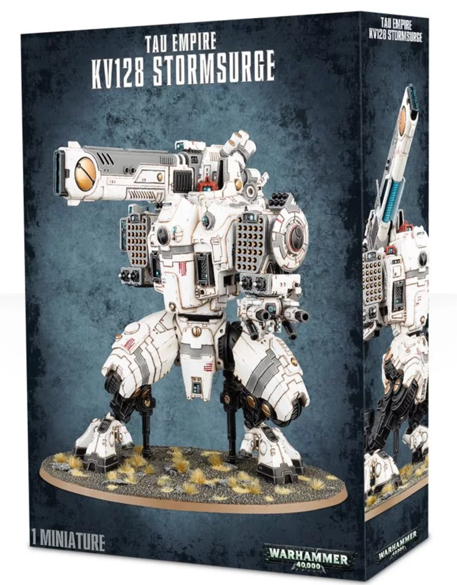 This multi-part plastic kit contains all the components necessary to build one KV128 Stormsurge, ballistic suit of the T’au Empire. It includes an astonishing 171 components – four head options, two pilot assemblies, a reactor suite, two leg assemblies and two sets of stabilising thrusters! Various vents and assemblies can be modelled optionally closed or open, and the whole miniature has incredible posability. Includes one Citadel 170mm Oval base.