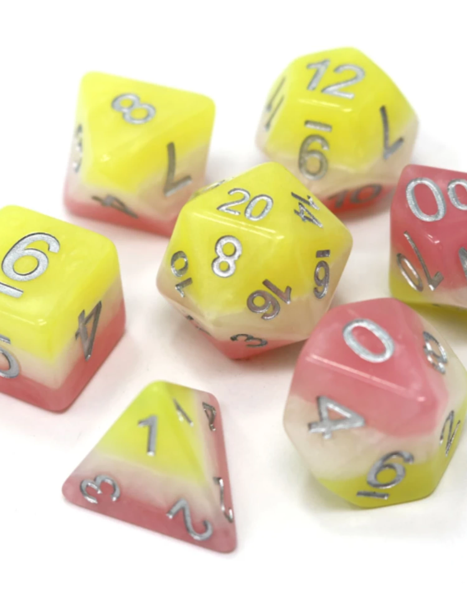 Set contains 1 – D4, 1 – D6, 1 – D8, 1 – D10, 1 – Tens 10, 1 – D12, 1 – D20
