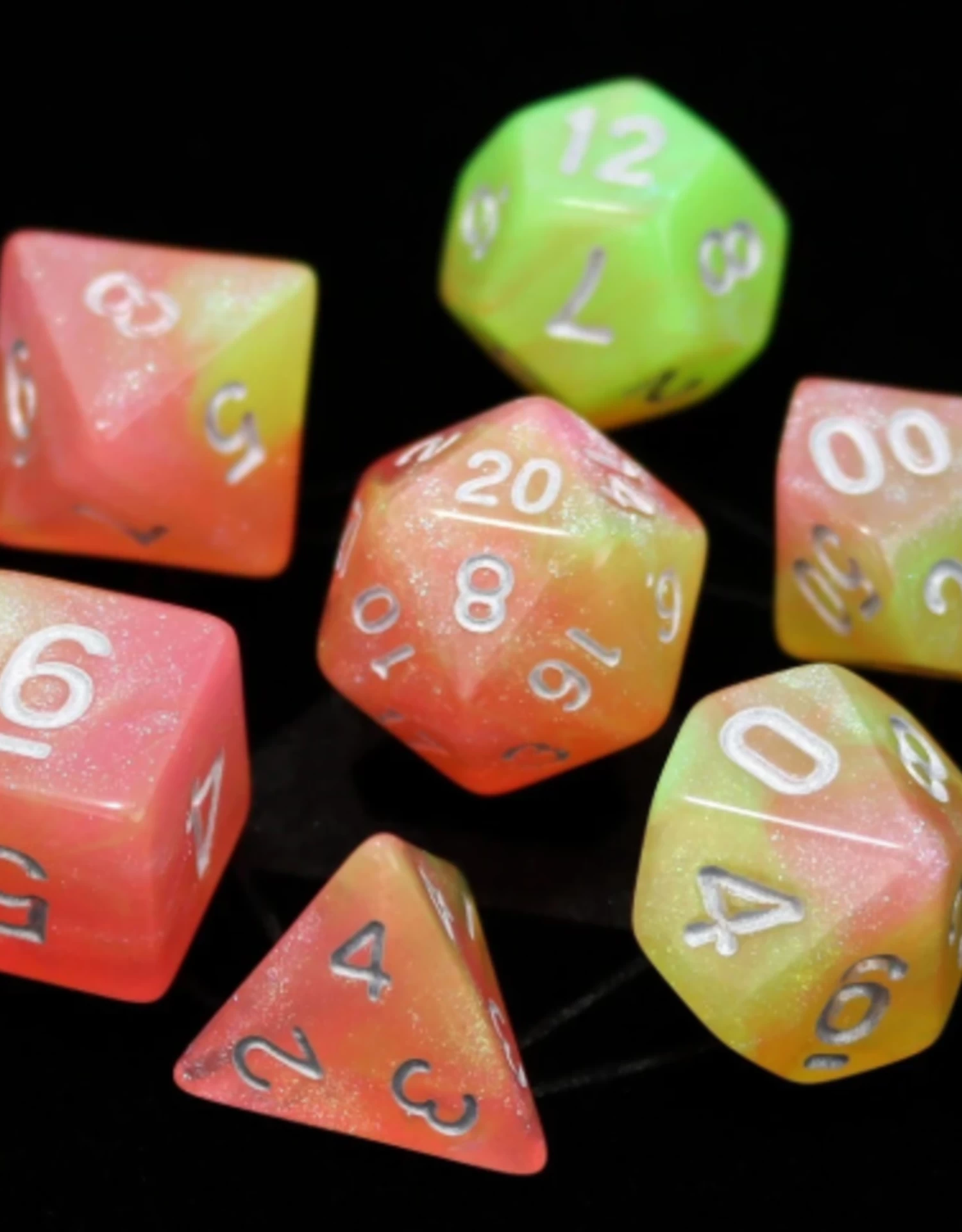 Set contains 1 – D4, 1 – D6, 1 – D8, 1 – D10, 1 – Tens 10, 1 – D12, 1 – D20